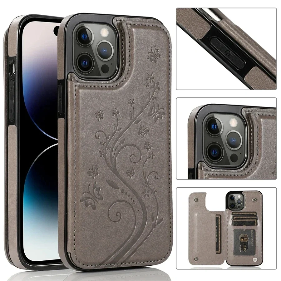 Flip Case For iPhone 11 -16 With Butterfly Embossing – Grey